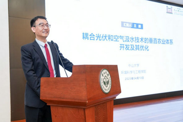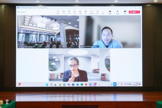颁奖环节,杨挺先生向王鹏教授颁发ACT-UR奖杯及证书,并合影留念。王鹏教授现场分享了团队未来重要研究方向——耦合光伏技术与空气汲水技术的垂直农业体系开发及优化,该技术有望通过高效利用太阳能与空气汲水,为干旱地区构建新型垂直农业供水体系提供创新方案。此外,王鹏教授还介绍了成人做爱 碳中和与绿色发展研究院的发展成果与未来布局,该研究院将为成人做爱 助力国家“双碳”目标实现提供重要支撑。